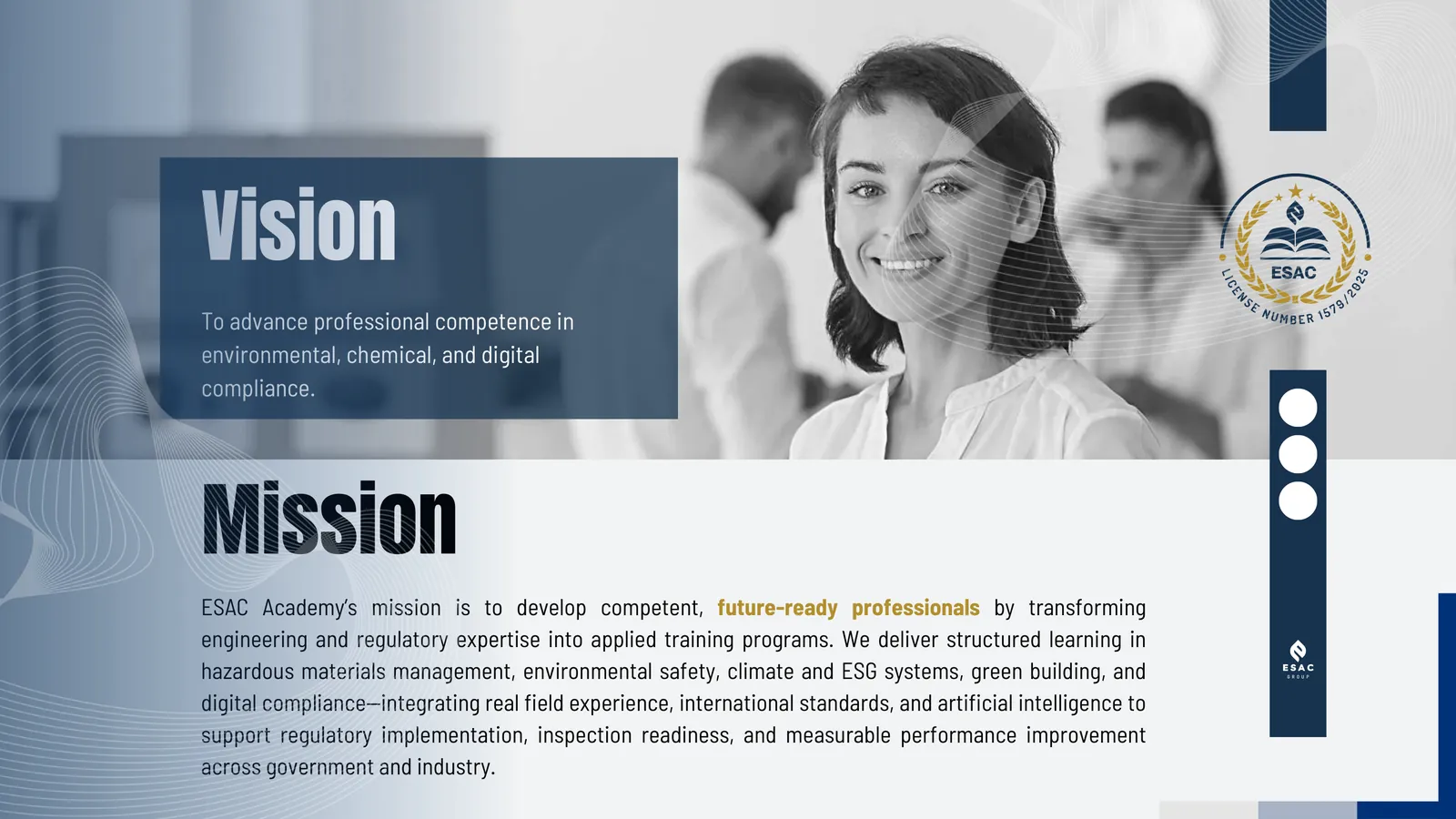 ESAC Academy is the professional development and capacity-building arm of ESAC Group, established to deliver high-impact specialized training aligned with the Group’s expertise in hazardous materials, climate action, ESG governance, green building, and digital compliance systems.